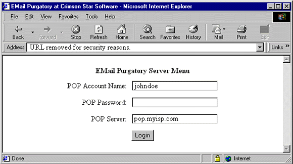 When you ordered your subscription, I asked you for your POP Account Name and your POP Server address. Email Purgatory looks up this information from its database, and fills in those fields for you. If either field is wrong, you can enter the correct information. If you did not provide that information, then it won't appear by magic - you must enter it yourself. You must enter your POP Password. All of this information comes from your ISP. If you don’t know what it is, ask them for help. Click the Login button to login to your POP server. You are now ready for Step 3. |