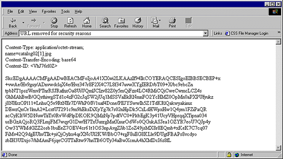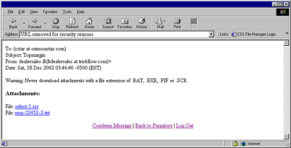 Notice that there is no message body, only the header information and some attachments. This is a bad sign. If there ever was a body to the message, it was 100% active content and Email Purgatory eats active content for breakfast. Sometimes you will receive messages that just do not have a body, only one or more attachments. If there are any attachments, you can click on them to preview them as pure, 100% safe text. One of these attachments is a file with a file extension of .scr. Email Purgatory warns you never download an attachment with a file extension of .scr. If you do, make sure your anti-virus definitions are up-to-date and hold your breath! When you are previewing any message, you can condemn the message right away, go back to Purgatory and condemn it there, or log out securely. Figure 8 shows an attachment full of nonsense. No, it is not a speech from the Canadian Prime Minister! It is an attachment that has been encrypted using Base64 encoding.