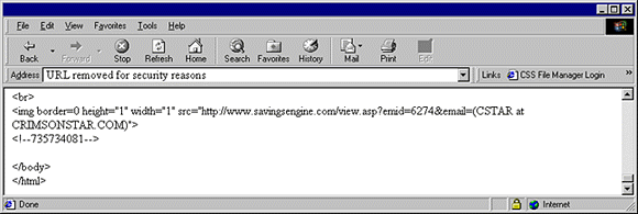 A Web beacon is a type of active content that attempts to send out private information about you to the spammer. In this case, it is trying to send them my email address and a secret code of some sort. It is easy to identify a Web beacon. First, a Web beacon is always an image and an image tag always starts with "<img". An image can have a size specified, but if that size is “height=1” and “width=1” than the image is virtually invisible, which should make you suspicious. There is always a source given in the “src” part, and if the source contains a “?” then everything following the question mark is information that will be sent to the spammer. So, if you see an image tag that contains a 1 x 1 sized image and the source includes a question mark followed by your email address or other secret information, then you have found a Web beacon. Congratulations! You should probably condemn any message or attachment that contains a Web beacon. At the very least, they are an invasion of privacy. At worst, the source may send you a virus or trojan instead of an image. |